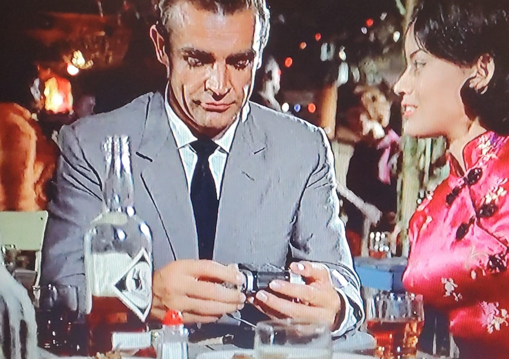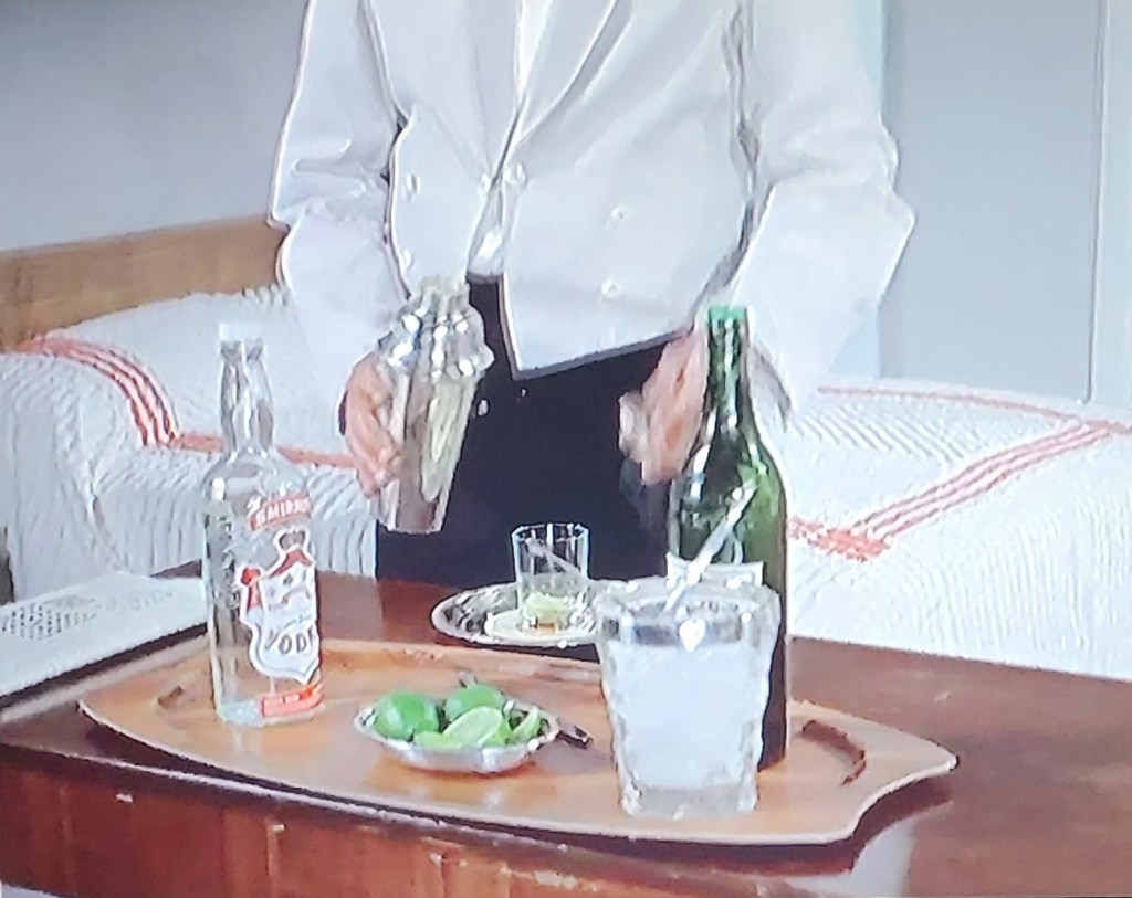 Bond’s first drink in Dr. No is a medium dry vodka martini, which he orders through room service at a hotel. The room service waiter brings a cart with some Smirnoff vodka, Lillet Blanc, and limes. He pours the ingredients in a shaker with some ice, shakes, pours it in a cocktail glass, and tells Bond “one medium dry vodka martini, mixed like you said sir, not stirred.” I found it interesting that this foretold Bond’s favorite martini, the Vesper, which is classically made shaken, not stirred.