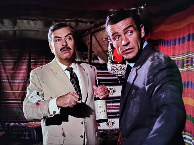 Raki is the national drink of Turkey. To assist in the defection, Bond meets the MI6 Istanbul branch head Ali Kerim Bey, and they get in a fight with SPECTRE. After Kerim Bey gets injured, they retreat, and he then drinks the Raki. Bond calls it “filthy stuff,” but Kerim Bey drinks.
