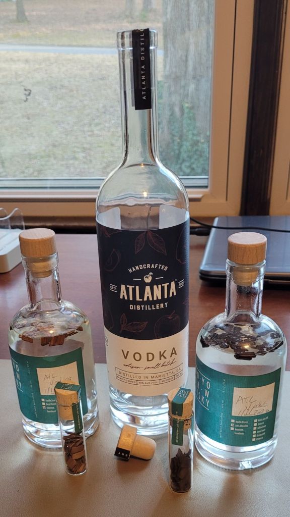 The infusion process involves two steps – wood infusion, then botanical infusion. The woods that are supplied are labeled Dark Chocolate, American Sweetheart, and Vanilla Dream. They are mixed with the vodka, and left to infuse for 2 to 4 weeks. Then, botanicals are added, in this case a choice of coffee beans, cocoa beans, cinnamon, chai mix, orange peel, or bird’s eye chili. These are mixed according to recipes provided, or according to however I wish, and left to infuse for another 24 hours, before all are strained out.